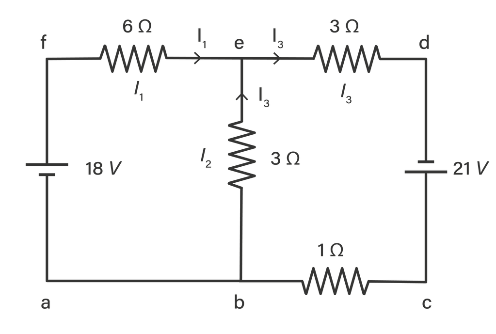 R1=6 ΩR2=3 ΩR3=3 ΩR4=1 ΩE1=18 VE2=21 V