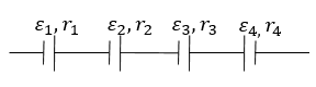 Sebanyak empat buah baterai disusun seperti gambar di atas. Besar hambatan dalam total susunan baterai di atas adalah ….