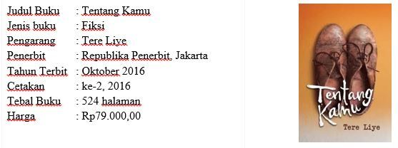 (1) Siapa yang tak kenal Tere Liye? Pengarang asal Sulawesi yang bernama asli Darwis ini telah meraih keberhasilan dalam dunia literasi Indonesia. Hobinya dalam menulis cerita telah banyak menghasilkan karya-karya yang luar biasa. Novel yang telah dipublikasikan di antaranya adalah Hafalan Shalat Delisa (2005), Bidadari-Bidadari Surga (2008), Pukat (2010), Kau, Aku dan Sepucuk Angpau Merah (2012), Hujan (2016), dan novel trilogi Bumi, Bulan, Matahari (2016). (2) Pada Oktober 2016, ia baru saja menyelesaikan kembali karyanya, yaitu novel berjudul Tentang Kamu. Tema yang yang dibawa novel ini bergenre petualangan, percintaan, persahabatan, pengkhianatan, dan kesabaran. Novel yang diterbitkan oleh REPUBLIKA ini memiliki sampul yang sederhana tapi elegan, gambar yang unik pada cover membuat penasaran banyak orang untuk mengetahui isi cerita dalam novel tersebut. (3) Cerita dalam novel Tentang Kamu berawal dari seorang Pengacara Internasional berdarah Indonesia yang bernama Zaman Zulkarnaen. Pemuda ini mendapat tugas dari firma hukum Thompson & co. untuk menyelidiki kasus klien besar, yaitu seorang wanita berumur 70-an yang baru saja meninggal di sebuah panti jompo di Paris. Wanita itu meninggalkan harta warisan bernilai satu miliar poundsterling atau setara dengan 19 triliun rupiah. Wanita tua yang meninggalkan harta sebanyak itu berasal dari Indonesia, ia bernama Sri Ningsih. Hal yang membuat kasus ini menarik adalah perusahaan firma hukum Thompson & co. hanya menyimpan surat keterangan bahwa Sri Ningsih adalah pemilik sah 1% surat saham di perusahaan besar, itu berarti tidak adanya surat wasiat yang ditinggalkan. (4) Ada sekiranya 33 bab dalam novel ini. Karakter dalam novel ini dapat memberi motivasi bagi kita, tak hanya kehidupan tokoh Sri Ningsih yang dibahas, kehidupan Zaman Zulkarnaen juga diceritakan, tetapi tidak mendetail. Buku ini cocok dibaca dan dimiliki untuk para remaja juga kalangan mahasiswa. Hal ini karena buku ini merupakan buku yang mendidik para pembacanya. (5) Novel Tentang Kamu ditulis dengan bahasa yang mudah dipahami, dibandingkan novel bergenre percintaan lainnya, novel ini memberi makna cinta yang sesungguhnya juga kata mutiara yang memotivasi. Kisah yang dikemas dengan bahasa khas Tereliye dapat menyihir pembacanya masuk dalam alur cerita. Sangat menikmati setiap katanya. Hal-hal lucu dalam novel ini juga dikemas dengan bahasa yang baik tapi tetap mengundang humor. Namun, pada novel ini memuat istilah-istilah yang asing bagi sebagian pembaca, seperti heir hunters, juga istilah dalam bahasa Inggris lainnya. Sumber diadaptasi dari https://www.kompasiana.com/ diunduh pada 5 Februari 2020