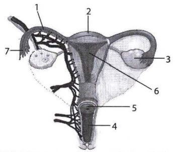Oogenesis, fertilisasi, dan implantasi zigot, secara berturut-turut terjadi di bagian bernomor ....