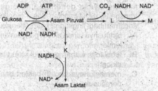 Berdasarkan skema respirasi tersebut, senyawa yang ditunjukkan pada bagian K, L, dan M secara berurutan adalah ...