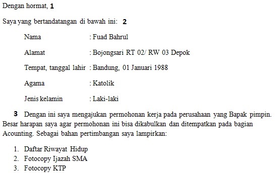 nomor dua merupakan isi surat lamaran kerja dan nomor tiga adalah bagian dari surat lamaran kerja