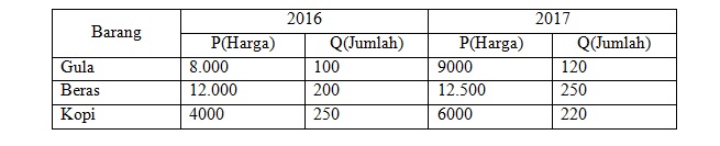 Berdasarkan data tersebut, nilai indeks harga Paasche adalah....