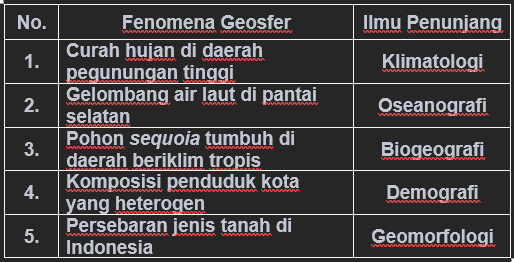 Berdasarkankan objek material geografi, ilmu penunjang yang sesuai dengan jenis fenomena geosfemya ditunjukkan oleh angka....