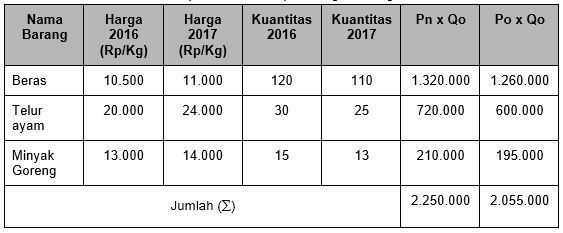 Berdasarkan data tersebut, maka indeks harga dengan menggunakan metode Laspeyres adalah ….