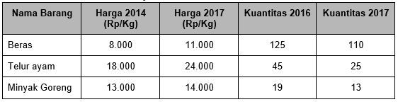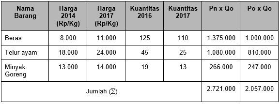 Berdasarkan data tersebut, maka indeks harga dengan menggunakan metode Laspeyres adalah ….
