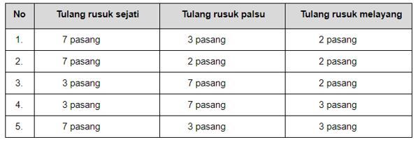Berdasarkan tabel diatas, jumlah tulang rusuk yang tepat ditunjukan oleh nomor….