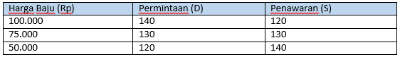 harga pasar Rp100.000, jumlah baju yang diminta 130, dan jumlah baju yang ditawarkan adalah 130
