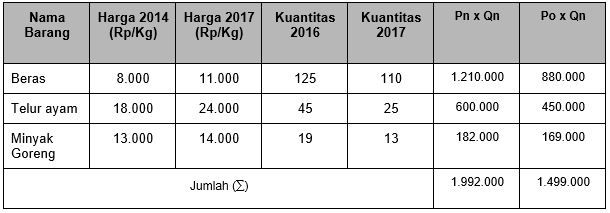 Berdasarkan tabel tersebut, nilai indeks harga pada tahun 2017 dengan menggunakan metode Paasche adalah ….