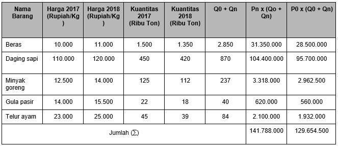 Berdasarkan tabel tersebut, nilai indeks harga pada tahun 2018 dengan menggunakan metode Marshall-Edgeworth adalah ….