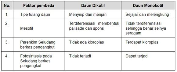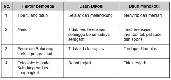 Berdasarkan tabel tersebut, perbedaan daun dikotil dan monokotil yang tepat ditunjukan oleh nomor ….