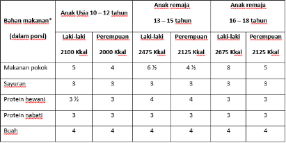 Kalori yang diperlukan oleh anak laki-laki umur 10-12 tahun sama dengan anak laki-laki umur 13-15 tahun