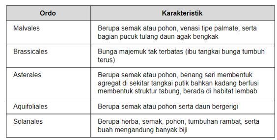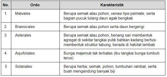 Contoh ordo dari kelas dikotil beserta karakteristiknya yang tepat ditunjukan oleh nomor….