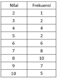 Pilihan C. Diagram batang pada pilihan C tidak sesuai dengan data pada tabel. Frekuensi nilai 3, 4, 5, 7, 8, dan 9 pada tabel berturut-turut adalah 2, 4, 2, 8, 10, dan 7, sedangkan frekuensi pada diagram batang berturut-turut adalah 1, 5, 3, 10, 12, dan 9. Dengan demikian, pilihan C bernilai SALAH.