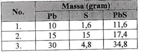 Jika massa Pb yang digunakan sebanyak 25 g, massa S yang diperlukan sebanyak ...