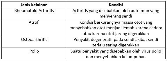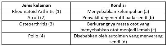 Pasangan yang benar mengenai jenis kelainan pada sistem gerak dan kondisinya adalah ….