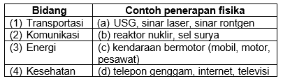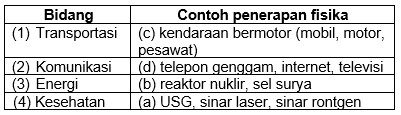 Pasangan yang tepat antara penerapan fisika dalam kehidupan sehari-hari sesuai dengan bidangnya adalah ….