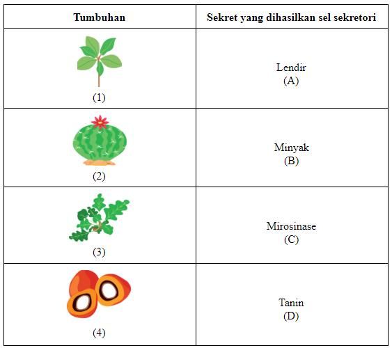 Pasangan yang tepat mengenai contoh tumbuhan dengan jenis sekret yang dihasilkan oleh sel sekretorinya ditunjukkan oleh ….
