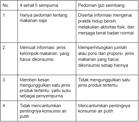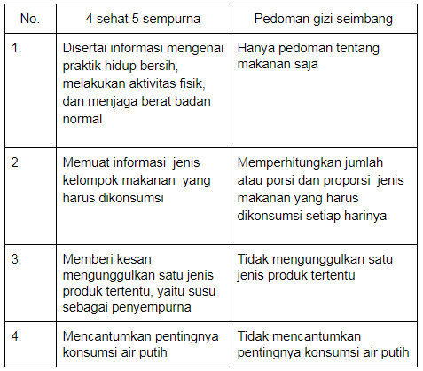 Perbedaan yang benar antara konsep 4 sehat 5 sempurna dan pedoman gizi seimbang ditunjukkan oleh nomor…
