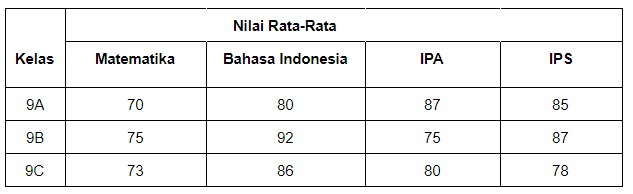 Kelas yang memiliki nilai tertinggi pada mata pelajaran yang sama dari seluruh mata pelajaran adalah ….