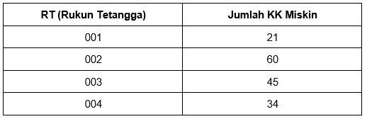 Berdasarkan data pada tabel tersebut, jumlah rata-rata kepala keluarga miskin di RW 005 adalah ....