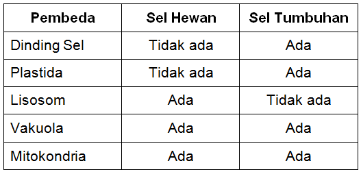 Lengkapilah tabel tersebut untuk menunjukkan perbedaan antara sel tumbuhan dengan sel hewan!