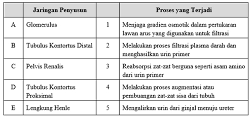 Pasangan yang tepat antara jaringan penyusun ginjal manusia dan proses yang terjadi di dalamnya adalah….
