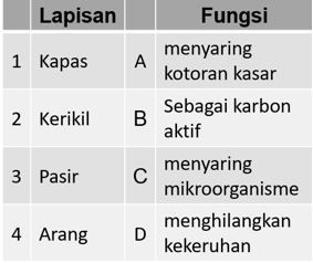 Pasangan yang tepat antara jenis lapisan teknologi pemurnian air sederhana dan fungsi dari lapisan tersebut adalah ….
