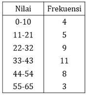 Berdasarkan tabel, frekuensi terbanyak adalah 11, sehingga kelas modusnya adalah 33-43. Tepi bawah kelas modusnya adalah