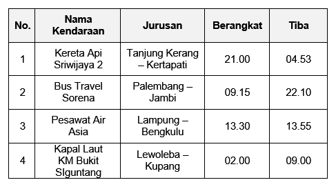 Pernyataan yang sesuai dengan jadwal perjalanan kendaraan di atas adalah ...