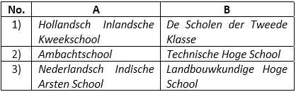 Sekolah tinggi yang didirikan oleh pemerintah kolonial Belanda ditunjukkan oleh kombinasi ...