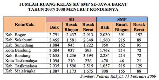 Kondisi ruang kelas di SD/SMP Se-Jawa Barat masih ditemukan ruang kelas dengan kondisi rusak.