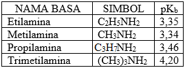 Suatu basa dengan konsentrasi 0,1 M memiliki pH = 11,825. Berdasarkan tabel, basa tersebut adalah ….
