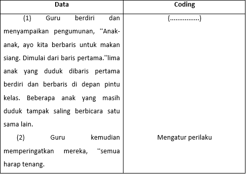 Tabel diatas adalah catatan lapangan observasi kegiatan belajar di sebuah TK, koding yang dapat dilakukan untuk paragraf pertama adalah... .