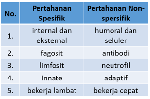 Perhatikan tabel ciri pertahanan spesifik dan non-spesifik berikut!