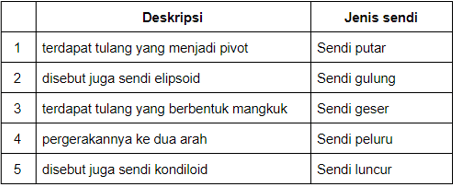 Berdasarkan tabel di atas, pernyataan yang tepat mengenai jenis sendi dan deskripsinya ditunjukkan oleh nomor…