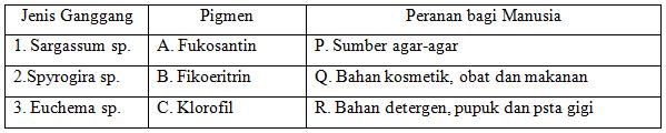 Berdasarkan tabel di atas yang menunjukkan hubungan yang benar antara jenis ganggang, pigmen dan peranannya bagi manusia adalah....