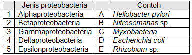 Pasangan yang tepat antara jenis proteobacteria dengan contohnya adalah ….
