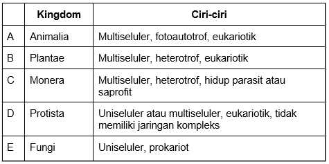 Pasangan yang tepat antara kingdom dengan ciri-ciri ditunjukkan oleh huruf ….