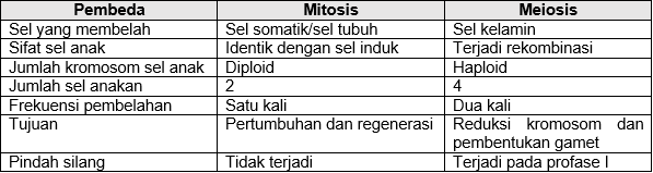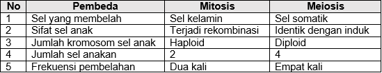 Perbedaan yang tepat antara pembelahan mitosis dan meiosis ditunjukkan oleh nomor ….