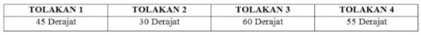 Seorang atlet tolak peluru melakukan 4 kali tolakan gaya O'brein, tolakan pertama sudut tolakannya 45 derajat, tolakan kedua sudut tolakannya 30 derajat, tolakan ketiga sudut tolakannya 60 derajat, tolakan keempat sudut tolakannya 55 derajat. Jika atlet tersebut menggunakan kekuatan dan kecepatan awal tolakan yang sama, manakah tolakan yang menghasilkan jarak lebih jauh?