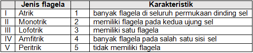 Pernyataan yang tepat antara jenis flagel dengan karakteristiknya adalah ….