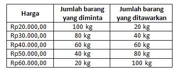 Keseimbangan pasar terjadi ketika harga jeruk Rp20.000,00 dengan jumlah jeruk yang diminta 100 kg dan jumlah jeruk yang ditawarkan 20 kg.