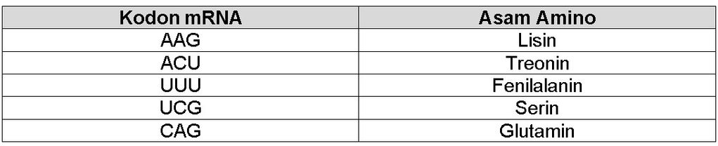 Apabila urutan triplet basa nitrogen pada rantai DNA yaitu GTC-AGC-AAA-TGA-TTC, urutan asam amino yang terbentuk adalah ....