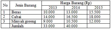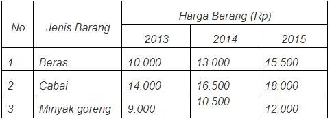 Perhatikan tabel jenis dan harga barang yang terjadi selama 3 tahun sebagai berikut!