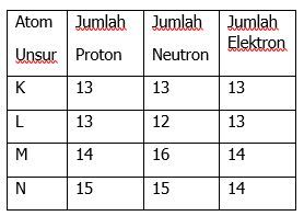 Perhatikan tabel jumlah partikel penyusun suatu atom di bawah ini: