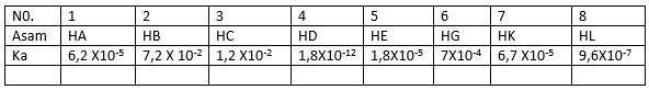 Berdasarkan tabel di atas, dapat ditarik kesimpulan bahwa kekuatan asam adalah ...
