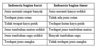 Faktor yang menjadi penyebab utama perbedaan jenis tumbuhan atau flora yang terdapat di Indonesia bagian barat dan timur adalah ....