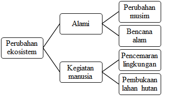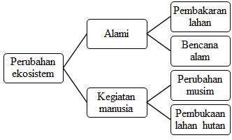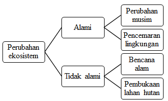Ekosistem mengalami perubahan baik secara alami maupun karena kegiatan manusia. Perubahan musim merupakan salah satu contoh perubahan alami. Selain musim, hal yang termasuk faktor perubahan alami adalah bencana alam berupa gunung meletus, gempa, tanah longsor, kebakaran hutan, tsunami, angin ribut, dan banjir. Manusia dapat menjadi faktor penyebab terjadinya perubahan ekosistem. Manusia melakukan berbagai kegiatan untuk memenuhi kebutuhan hidupnya. Pembukaan lahan hutan untuk dijadikan sawah dan perkebunan akan mengubah ekosistem. Kegiatan manusia yang menimbulkan pencemaran lingkungan, dapat mengubah keseimbangan ekosistem. Masih banyak lagi kegiatan manusia yang dapat mengubah ekosistem.