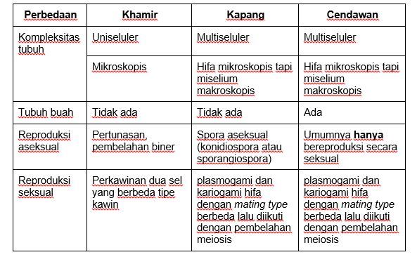 Pernyataan berikut yang benar mengenai perbedaan khamir, kapang, dan cendawan yaitu...